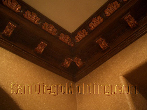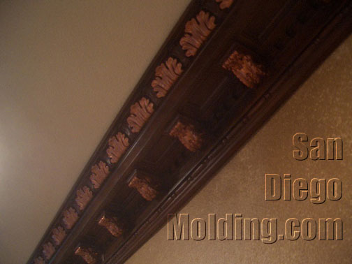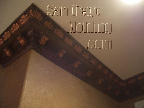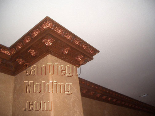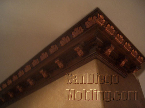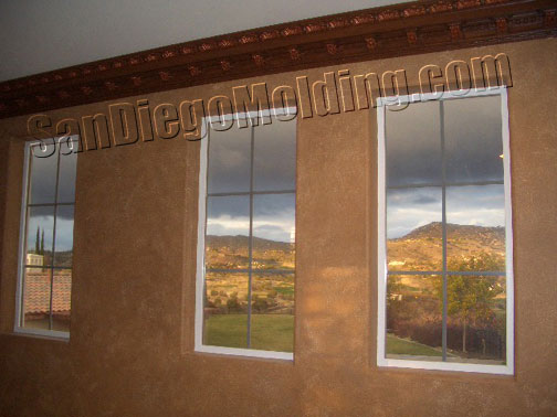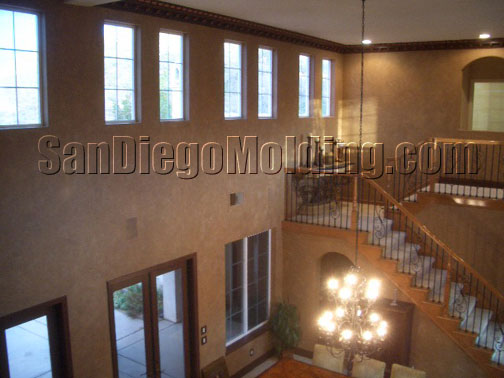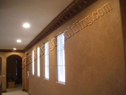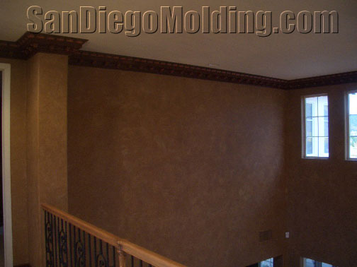 Great rooms need great crown molding.This great wide room could certainly accommodate this big 13' massive crown. This home features an tuscan style. We choose this "Chemcrest" crown molding for it's size and for it's old world European style.We faux painted it to look like wood and applied gold strokes to make the leaves stand out.